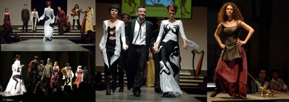 Felix wollte auf Nummer sicher gehen und so bestellte er uns zwischen 10 und 12 Uhr nach Trier in die St. Maximin Kirche, obwohl die erste Schau erst um 18.30 Uhr beginnen sollte. Für uns war es nicht so einfach sich in dem Chaos zurecht zu finden, und auch vom Zeitplan hatte niemand so recht Ahnung. Felix selber war die ganze Zeit, mit der allgemeinen Organisation beschäftigt und scheuchte angehende Designerinnen und deren Models hin und her. Laufprobe, Schminken und Friesieren wurden zu einem Spießrutenlauf, denn entweder war die Bühne gerade nicht frei, die Friseuse hatte keine Ahnung von dem, was sie da tun sollte, die Visagistin war auf einmal verschwunden oder vor uns standen noch 20 weitere Damen. Mittelerweile hatten sich noch 2 Jungs und 3 Mädels zu uns gesellt, außerdem noch eine Dame, die ebenfalls gerade ihr Diplom machte. Felix hatte zu unseren Kostümen 6 moderne Interpretationen geschneidert, die von den anderen präsentiert werden würden.